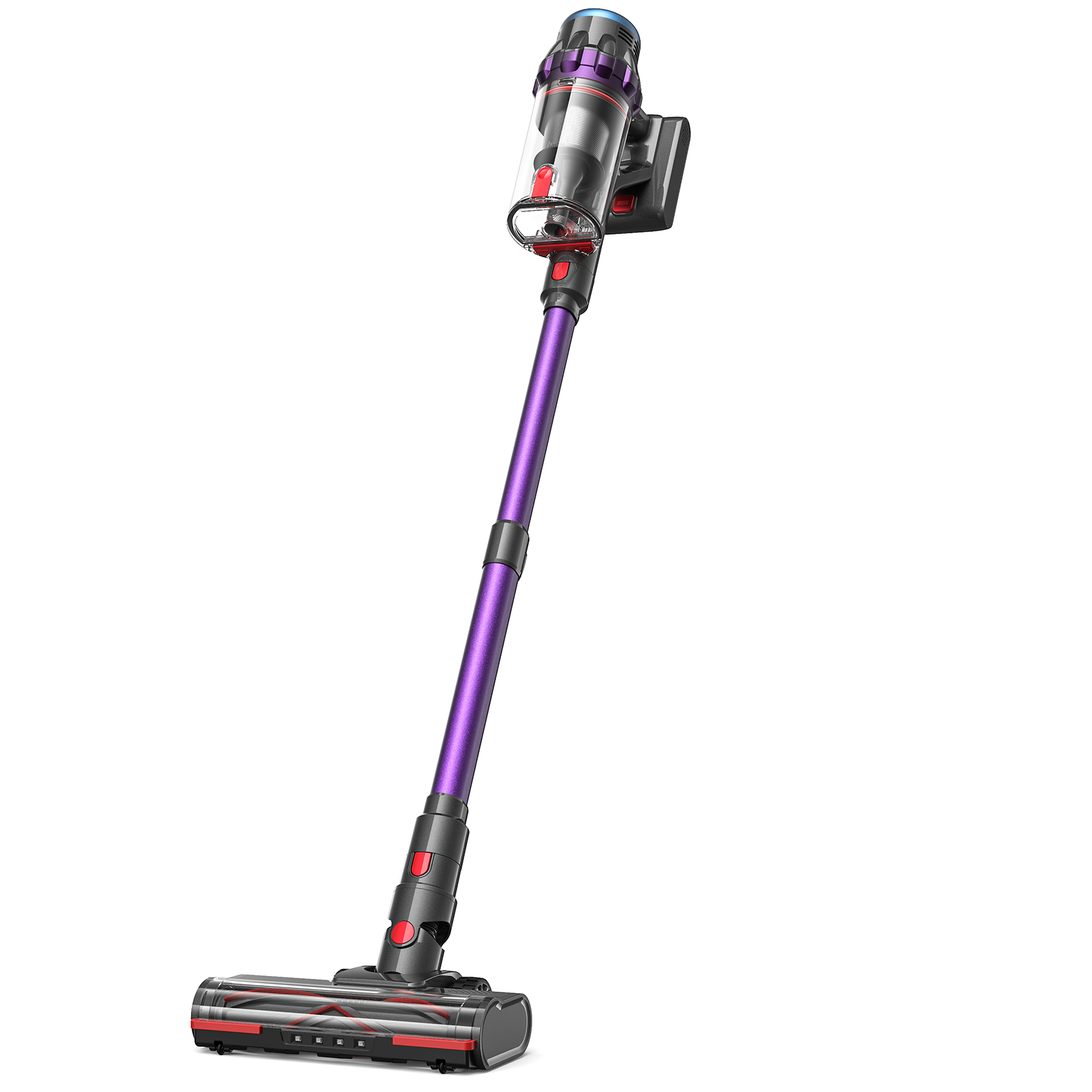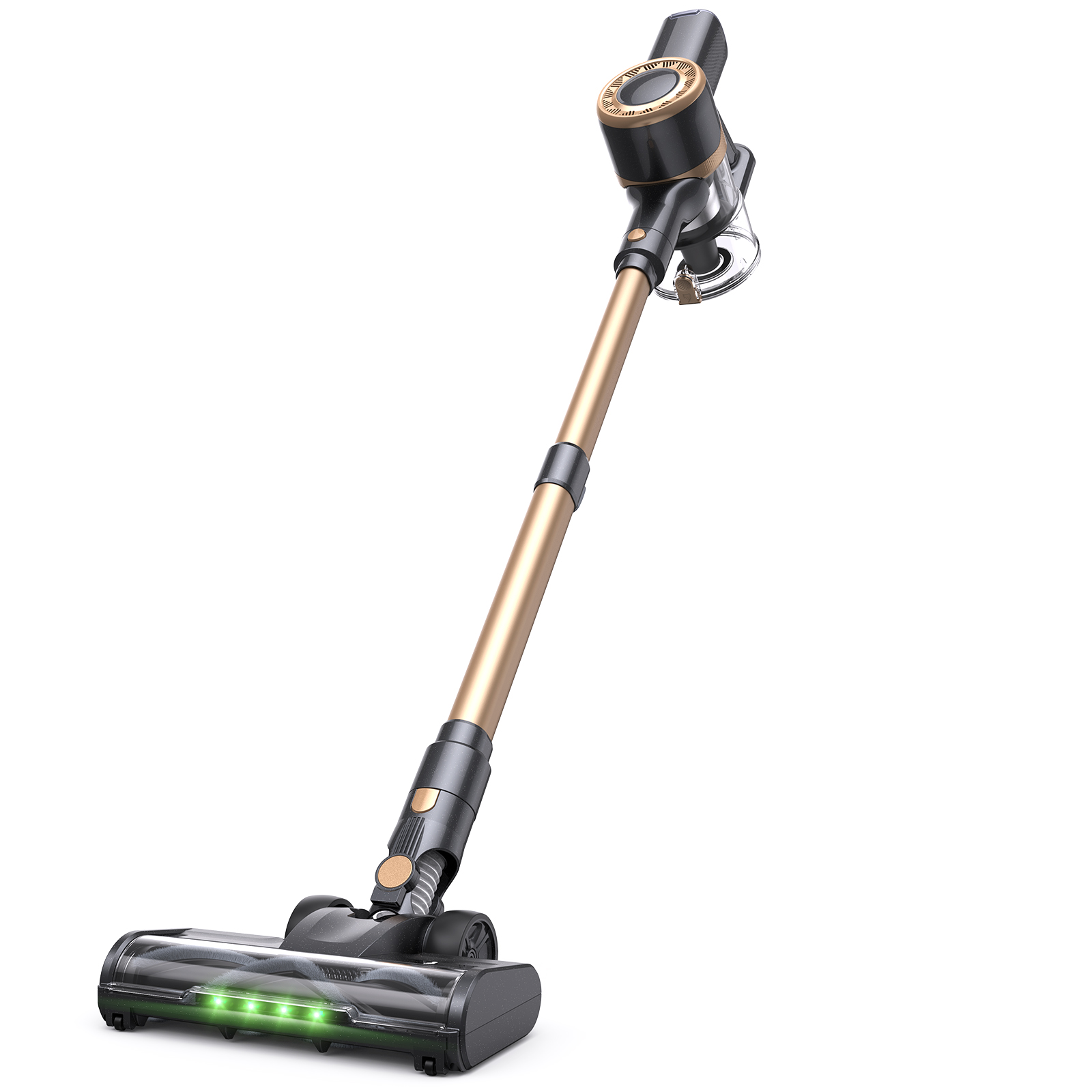 Vacuum cleaner with green light feature on a gray background