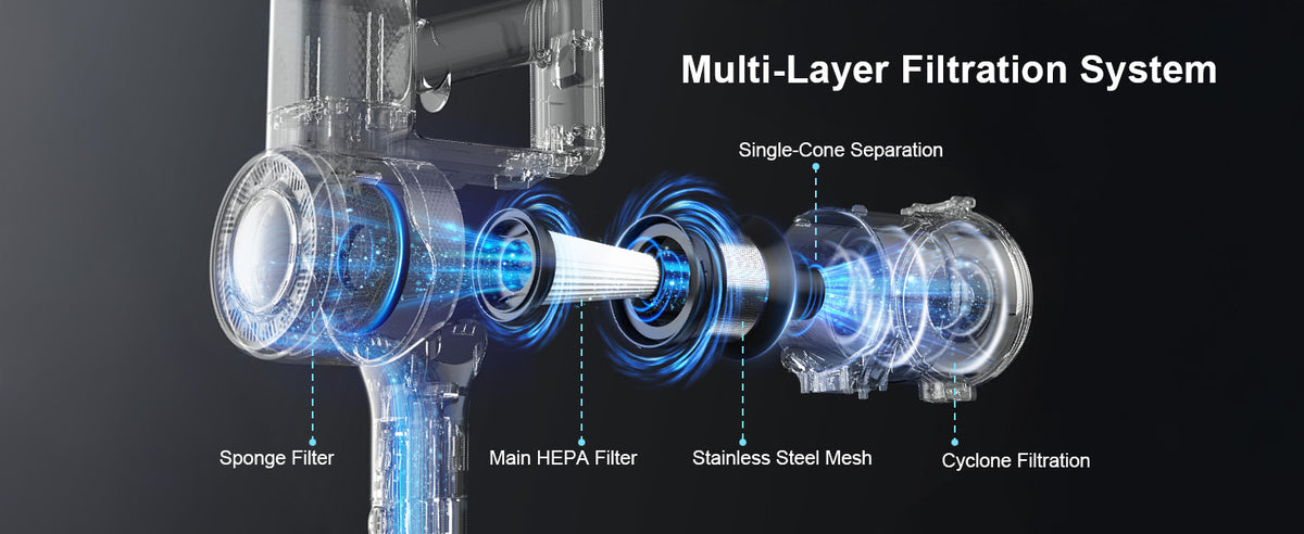 Καθαρισμός αέρα: Ολοκληρωμένο σύστημα φιλτραρίσματος με κυκλωνική δράση, ενιαία κωνική καθίζηση, πλέγμα από ανοξείδωτο χάλυβα, φίλτρο εισόδου HEPA και φιλτράρισμα με σφουγγάρι εξόδου. Εκτεταμένα διαστήματα συντήρησης: Το φίλτρο HEPA υψηλής χωρητικότητας παρέχει έως και 2 μήνες χρήσης χωρίς καθαρισμό - ιδανικό για άτομα που υποφέρουν από αλλεργίες. Μηδενική δευτερογενής ρύπανση: Το σφραγισμένο σύστημα διασφαλίζει ότι η σκόνη και τα αλλεργιογόνα που έχουν συσσωρευτεί παραμένουν παγιδευμένα, απελευθερώνοντας μόνο καθαρό, καθαρισμένο αέρα.