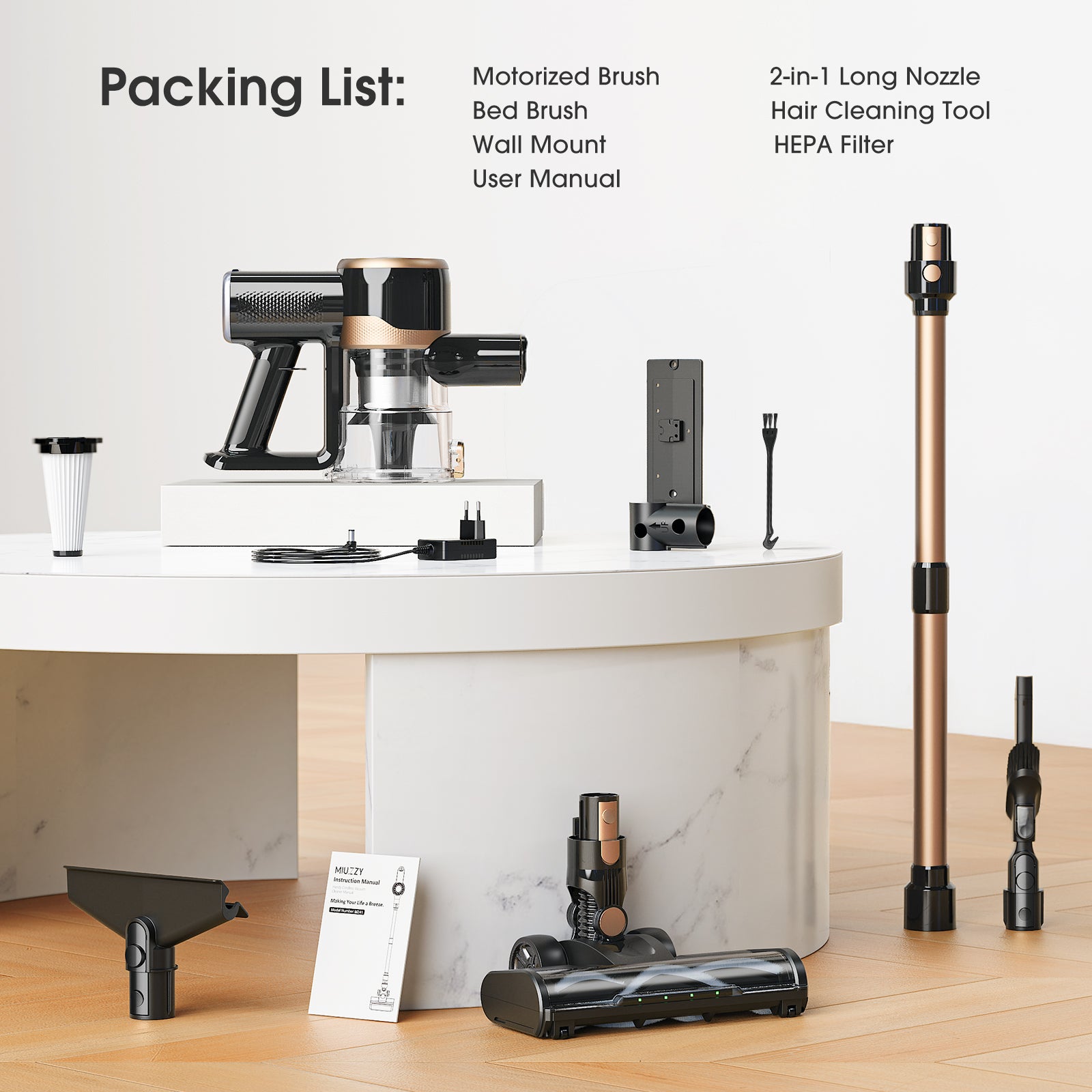 Packing list of a cleaning tool with various attachments on a white surface.